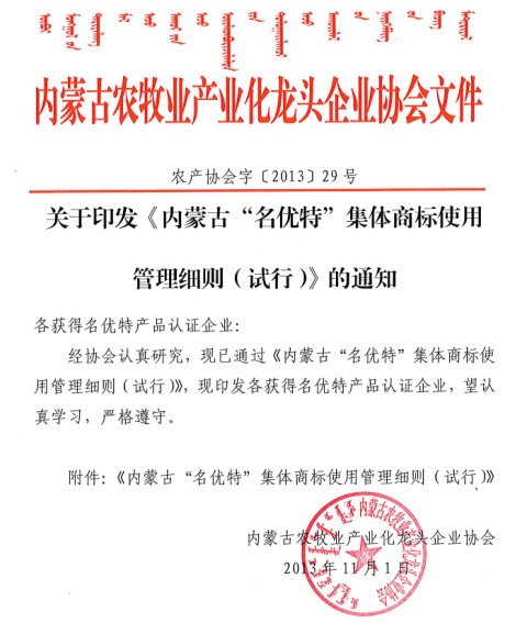 關于印發《內(nèi)蒙古“名優特”集體(tǐ)商标使用管理(lǐ)細則(試行(xíng))的通(tōng)知》