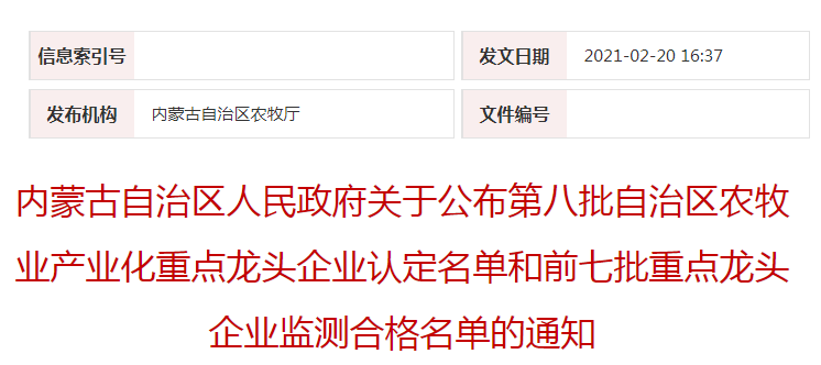 企業名稱:內(nèi)蒙古自治區(qū)人(rén)民政府關于公布第八批自治區(qū)農牧業産業化重點龍頭企業認定名單和(hé)前七批重點龍頭企業監測合格名單的通(tōng)知